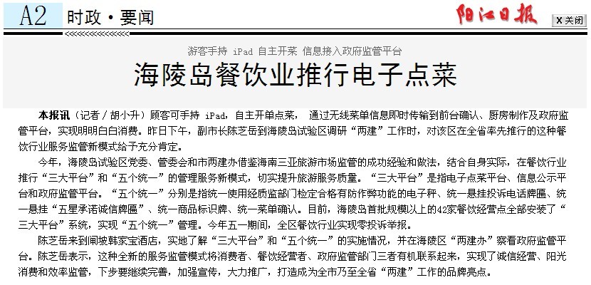 Ymenu三大平台 助力打造阳江海陵区和谐舒适的旅游环境!顾客可手持 iPad,自主开单点菜, 通过无线菜单信息即时传输到前台确认、厨房制作及政府监管平台,实现明明白白消费。
