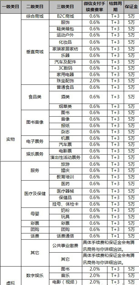 据了解,开设微信店铺的商户,需缴纳5万元保证金,存入微信为商户开通的专属财付通账号,并由财付通进行资金冻结。同时,微信将收取最低0.6%,最高达2%的支付手续费。与支付宝不同的是,微信支付采用即时到账模式,非担保交易,买家付款后,资金直接进入卖家财付通账户,不过需要等待3天后方可结算、提现。