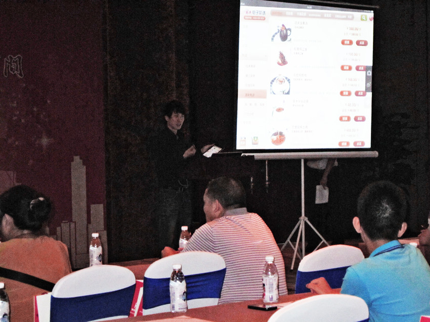 图:e餐通四川区域销售经理伍永根采用ipad实时投影的形式演示e餐通电子菜谱功能
